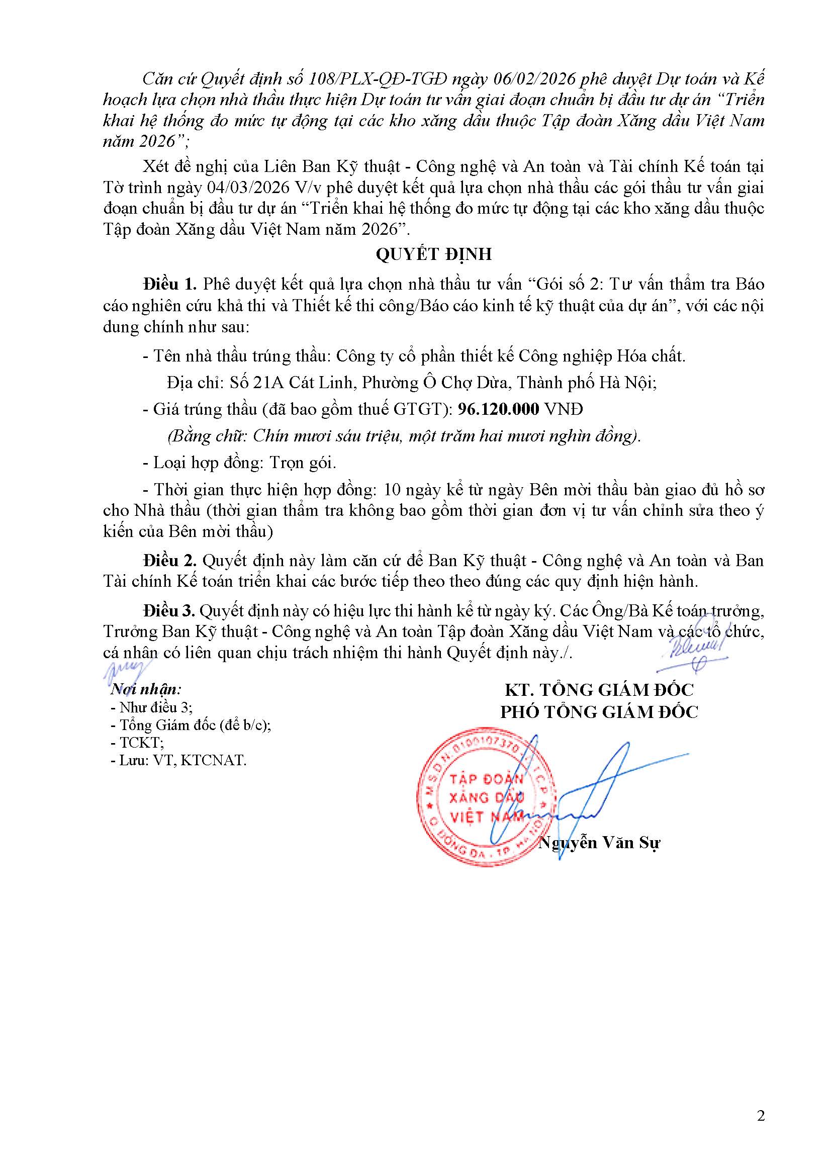 Quyết định phê duyệt kết quả LCNT tư vấn Gói số 2 giai đoạn chuẩn bị đầu tư dự án “Triển khai hệ thống đo mức tự động tại các kho xăng dầu thuộc Tập đoàn Xăng dầu Việt Nam năm 2026